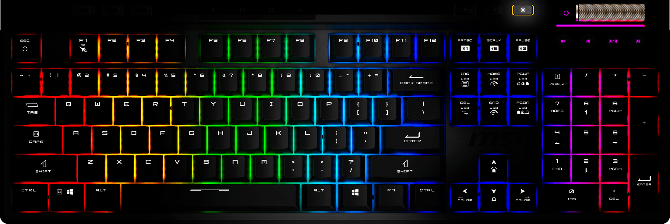 Diseña y personaliza tu configuración única con MSI Mystic Light y el control RGB por tecla. Elija entre impresionantes efectos de iluminación y hasta 16 millones de colores, adaptando los efectos a las teclas individuales para una experiencia personalizada. Con un botón dedicado para recorrer fácilmente los efectos de iluminación, junto con teclas de acceso rápido personalizables, puede ajustar rápidamente la iluminación y los comandos para adaptarse a cualquier estado de ánimo o tarea.