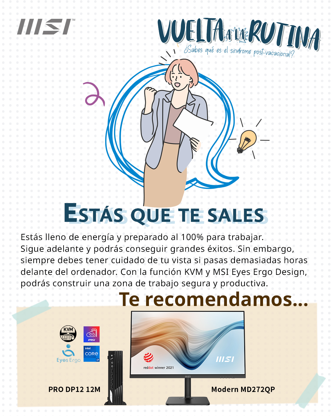 ¡Genial! Estás lleno de energía y preparado al 100% para trabajar. Sigue adelante y podrás conseguir grandes éxitos. Sin embargo, siempre debes tener cuidado de tu vista si pasas demasiadas horas delante del ordenador. Con la función KVM y MSI Eyes Ergo Design, podrás construir una zona de trabajo segura y productiva.