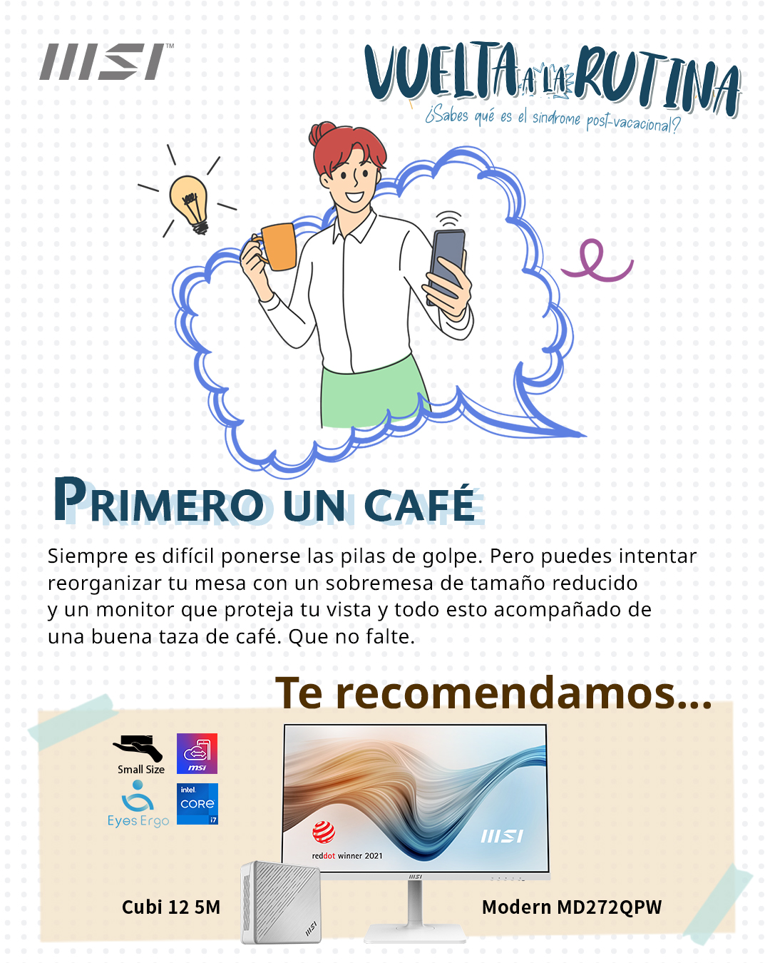 Siempre es difícil ponerse las pilas de golpe. Pero puedes intentar reorganizar tu mesa con un sobremesa de tamaño tamaño reducido y un monitor que proteja tu vista y todo esto acompañado de una buena taza de café. Que no falte.
